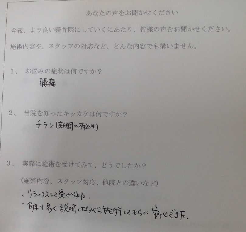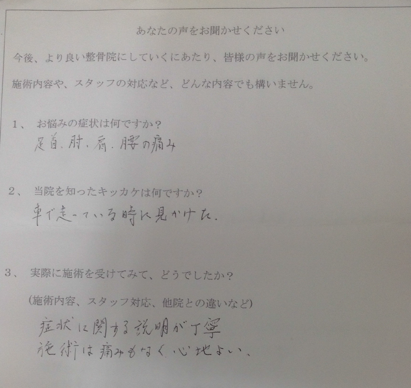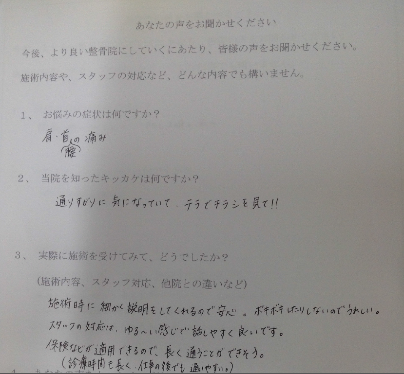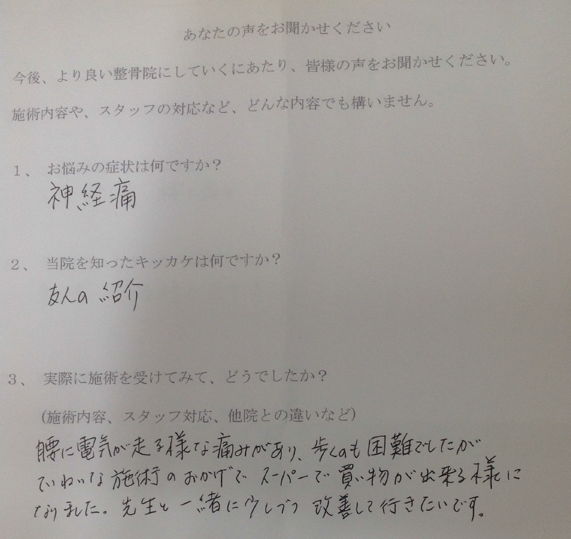 腰に電気が走る様な痛みがあり、歩くのも困難でしたが、ていねいな施術のおかげでスーパーで買い物が出来る様になりました。先生といっしょに少しずつ改善して行きたいです。