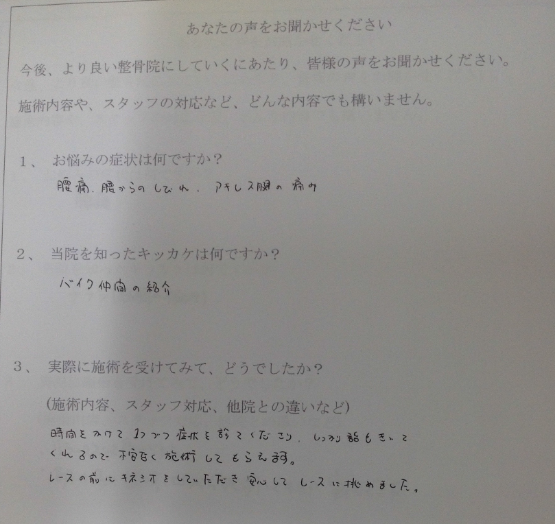 時間をかけて1つづつ症状を診てくださり、しっかり話も聞いてくれるので不安なく施術してもらえます。レースの前に、キネシオをしていただき安心してレースに挑めました。