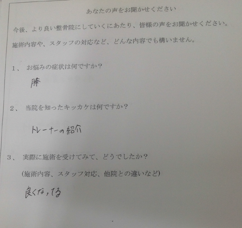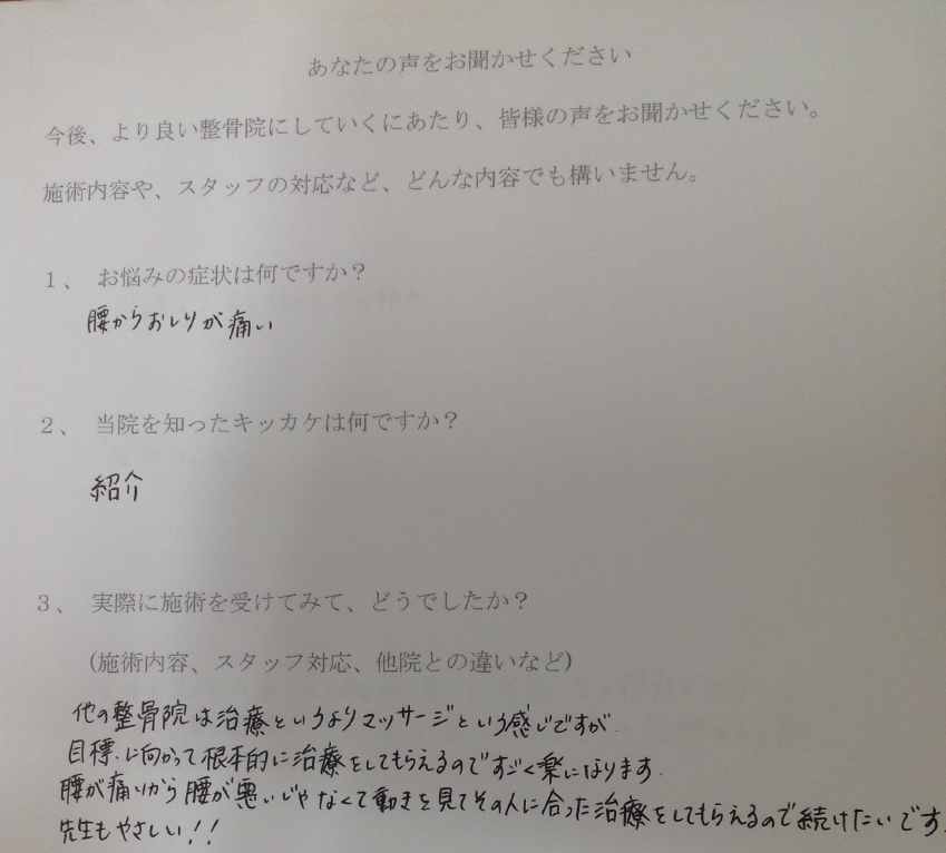他の整骨院は治療というよりマッサージという感じですが、目標に向かって根本的に治療をしてもらえるのですごく楽になります。腰が痛いから腰が悪いじゃなくて動きを見てその人に合った治療をしてもらえるので続けたいです。先生もやさしい!!
